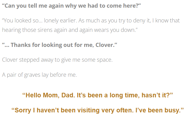 Conversely, I included or omitted comedic options in A Wistful Cry depending on how deeply I wanted the players to consider a particular choice. In some segments, they were used to add a lighthearted break; for serious decisions, however, the sudden lack of them encouraged players to think harder about their choice rather than defaulting to a funny option.