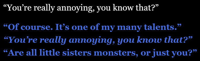 Despite the lack of voice acting or sound, I leveraged my text display system to convey nuanced tone and voice information in the dialogue of Familiar Delusion, such as in this gag