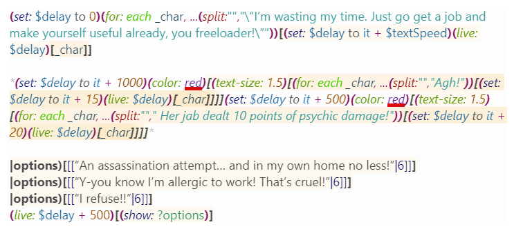 The most notable example is the custom text-rendering logic I created for Familiar Delusion. Normally, Twine displays all text per screen instantly, but I wanted to give a more natural feeling flow to speech by modulating the way text displays. To accomplish this, I programmed an entirely self-made system that displays text character-by-character, reminiscent of RPGs or similar games.