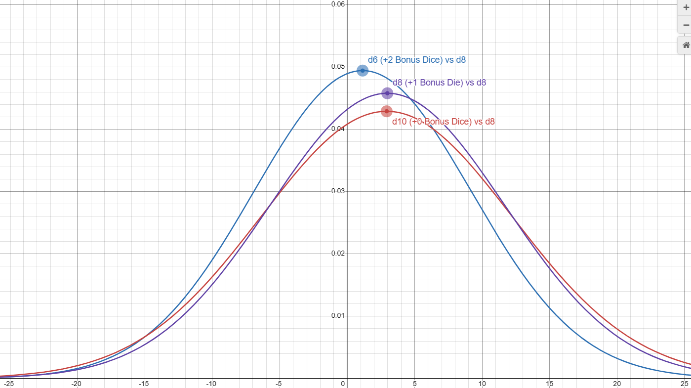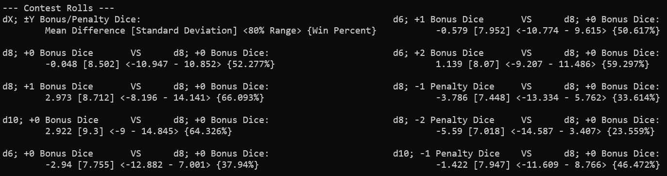 As Crimson Incantation features contested rolls quite frequently, testing different bonuses, penalties, and base statistics against each other—as shown here—was important.