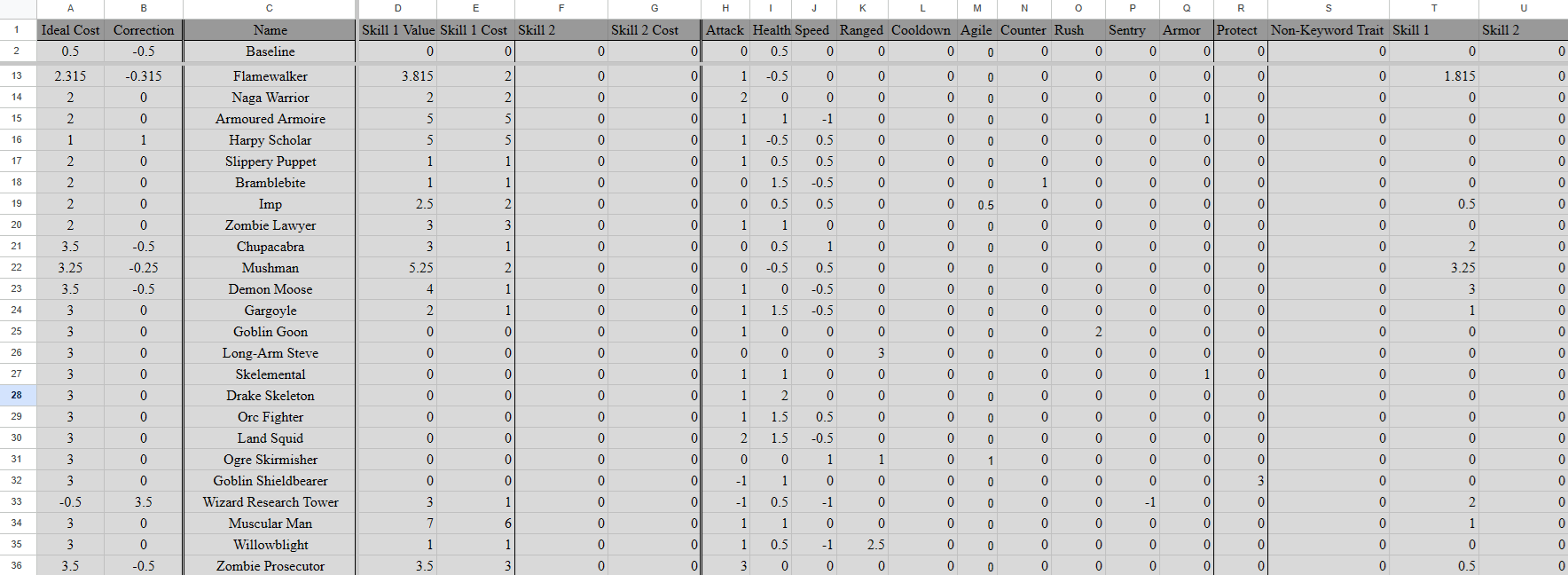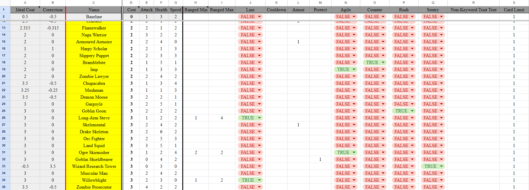 The monster card data spreadsheet used to design and balance cards for Cardinomicon.