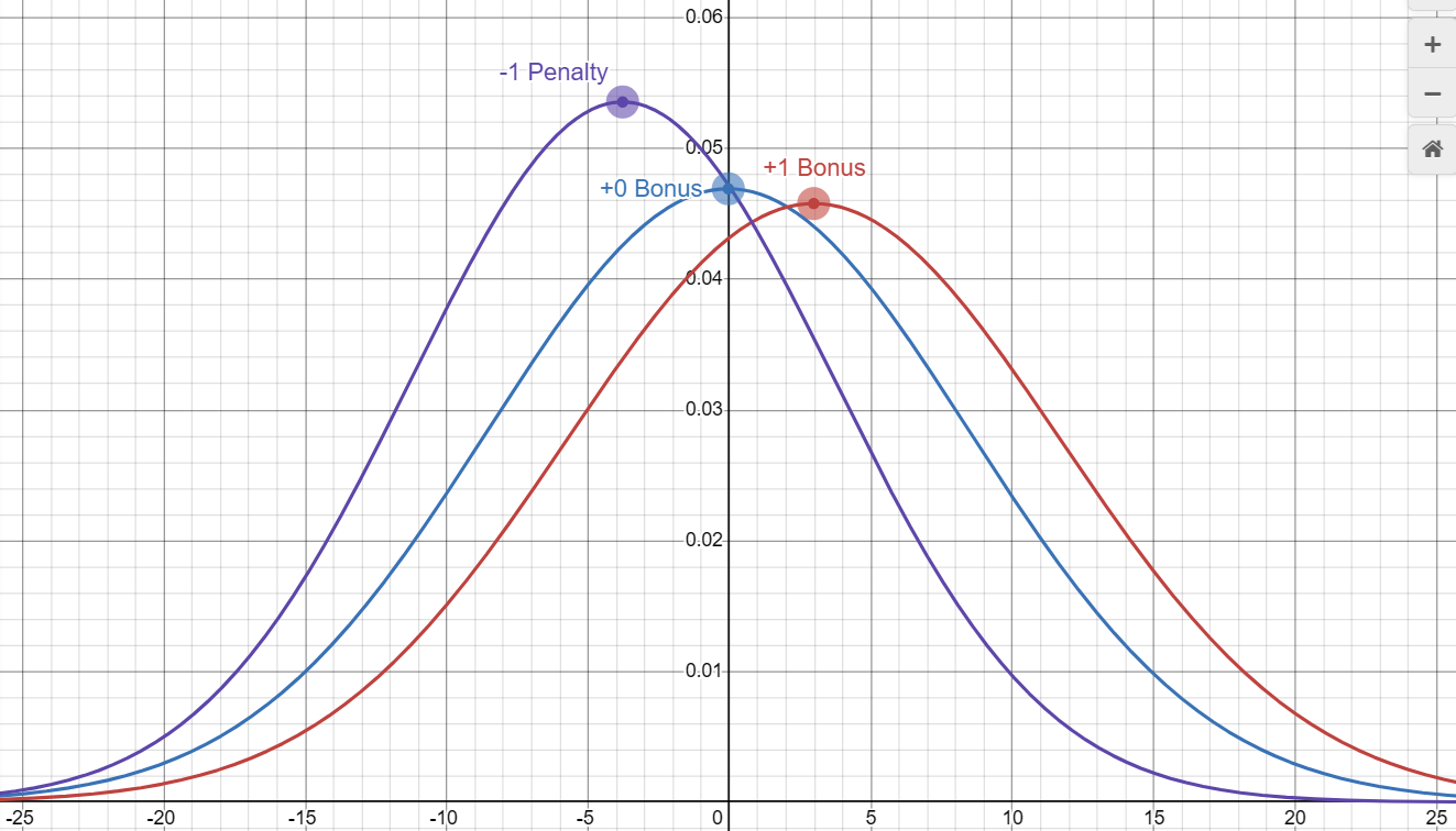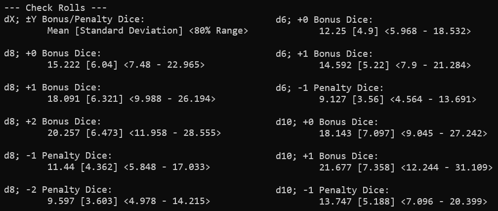Probabilistically, bonus and penalty dice affect the outcome of rolls in complex ways, making Monte Carlo simulations like this ideal.
