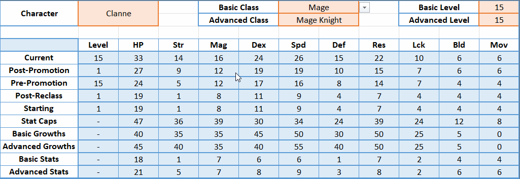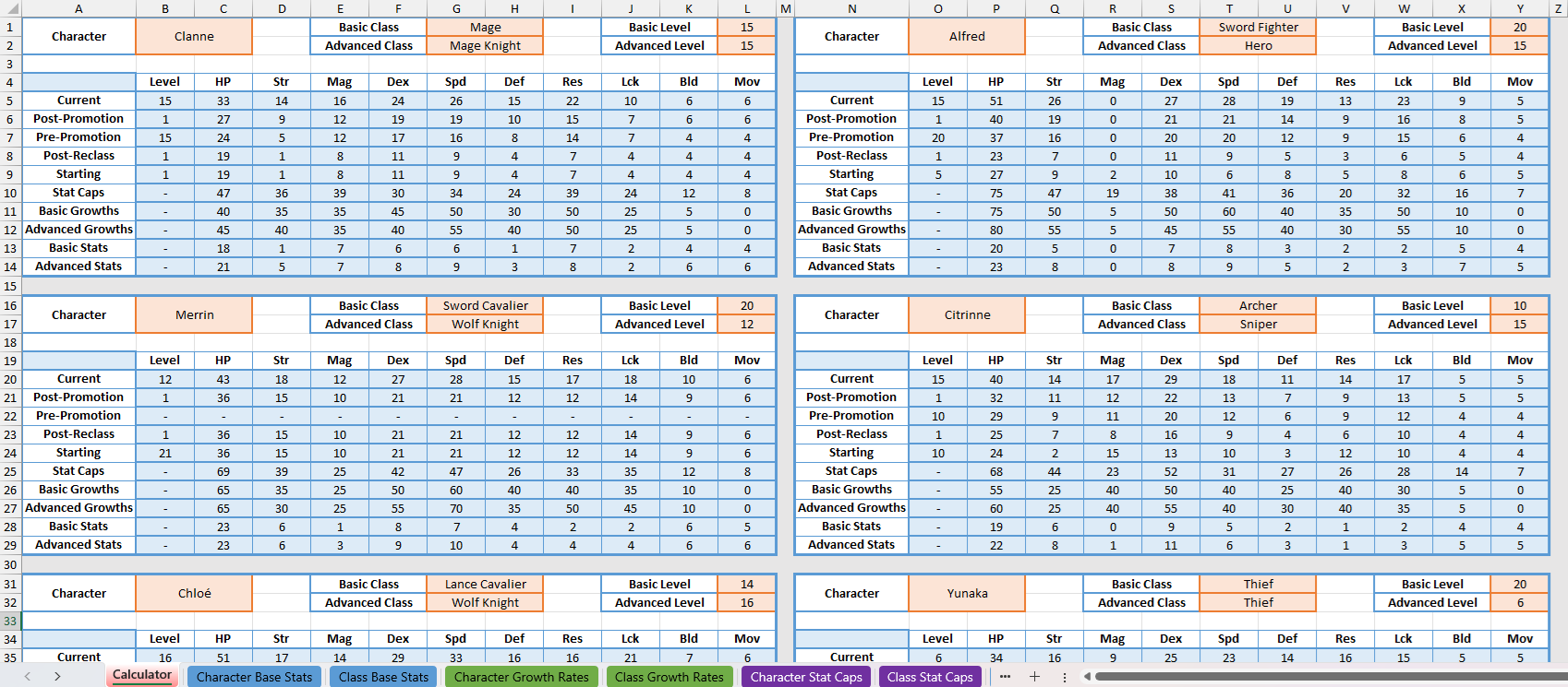I collected a large amount of internal game data, such as stat growth rates, stat caps, base stats, etc. This data is automatically used in the calculations based on five user-set values: Character, Basic Class, Advanced Class, Basic Level, and Advanced Level.