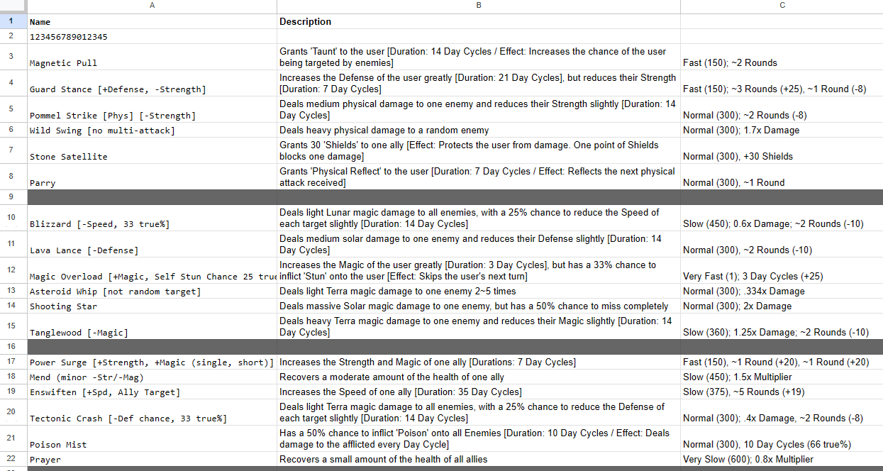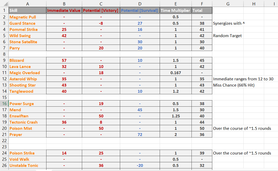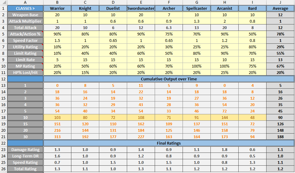 A character class balancing spreadsheet for an unreleased turn-based RPG I developed.